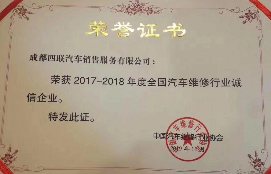 作为龙泉驿区知名汽车维修企业,维修质量优良、收费合理,该企业多次获得市级区级主管单位表彰以及各定点维修单位的良好评价,自2007年开展企业质量信誉评定以来,连续15年均被行业部门评定为质量信誉AAA企业,多次被主管单位评为先进集体、用户满意服务单位和优质维修企业;2014年被四川省汽车汽配服务业商会评为“2013年度四川省汽车行业AAA诚信企业”;2019年度被评为“全国汽车维修行业2017-2018年度诚信企业”。