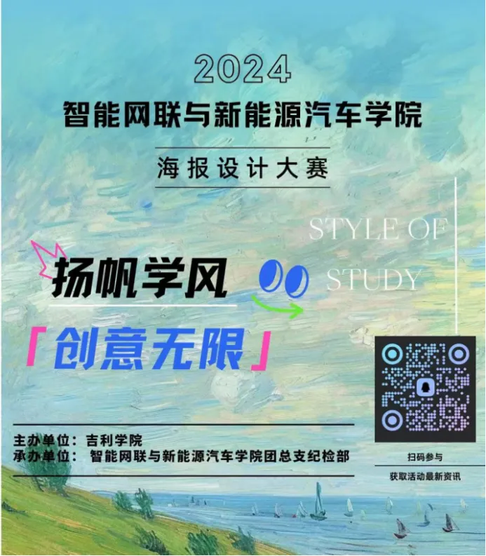 “扬帆学风,创意无限——校园学风建设海报征集令!学风是一所大学的灵魂,良好的学风犹如阳光雨露,滋养着莘莘学子茁壮成长。在这片知识的沃土上,让我们用画笔描绘校园的每一处风景,用创意展现学习的每一刻精彩。