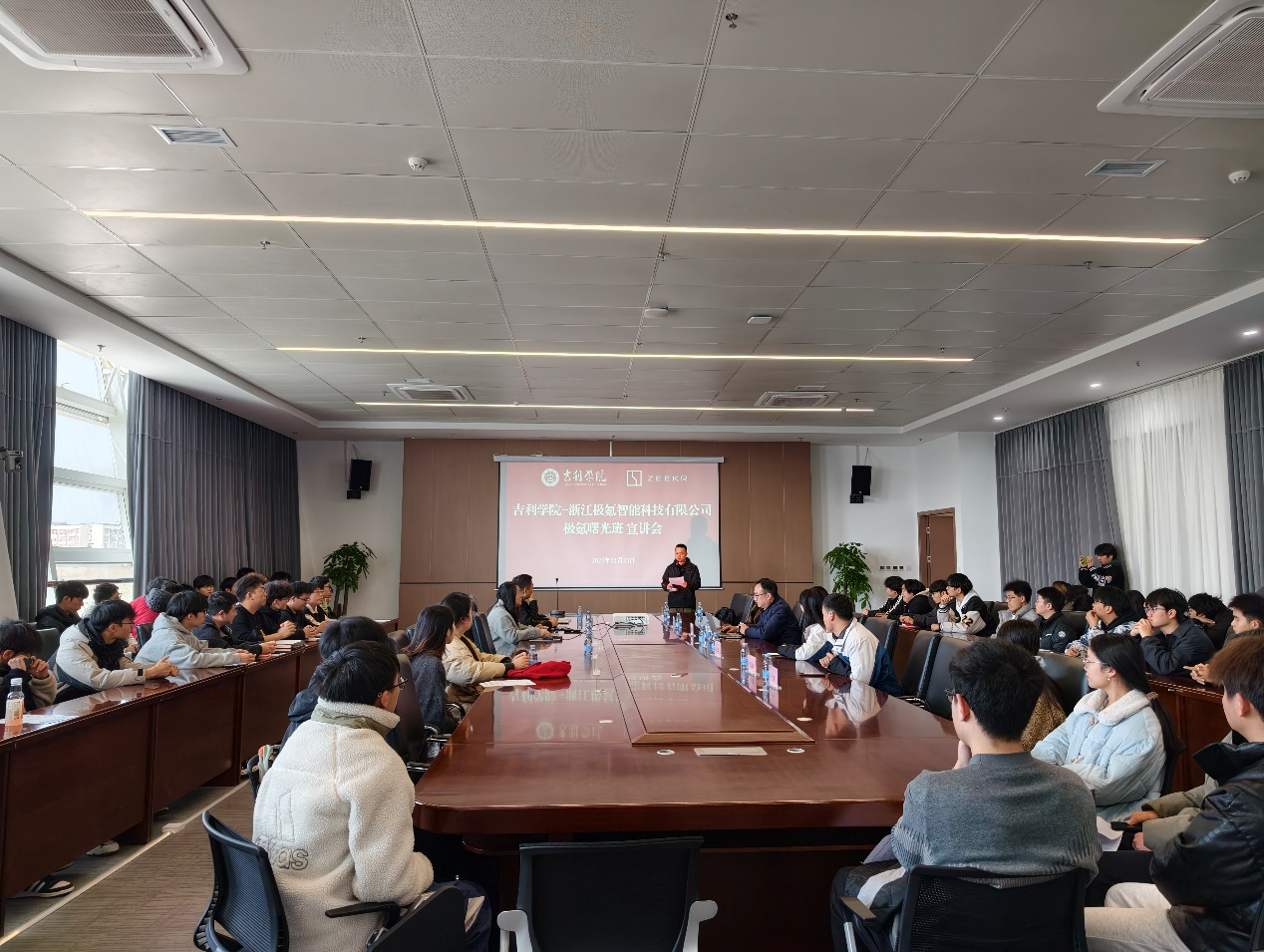 为深化产教融合,落实三个校园战略,助力学生精准对接行业需求、实现高质量就业,2025 年 12 月 23 日,吉利学院智能网联与新能源汽车学院联合浙江极氪智能科技有限公司成功举办 2026 极氪曙光班招募宣讲会。智能网联与新能源汽车学院院长施一飞、浙江极氪智能科技有限公司服务培训经理曾斌强、院长助理谭年琼、汽车服务工程教研室副主任刘文熙及相关教师代表出席活动。新能源汽车工程、车辆工程、汽车服务工程等相关专业近百名学生到场参与。