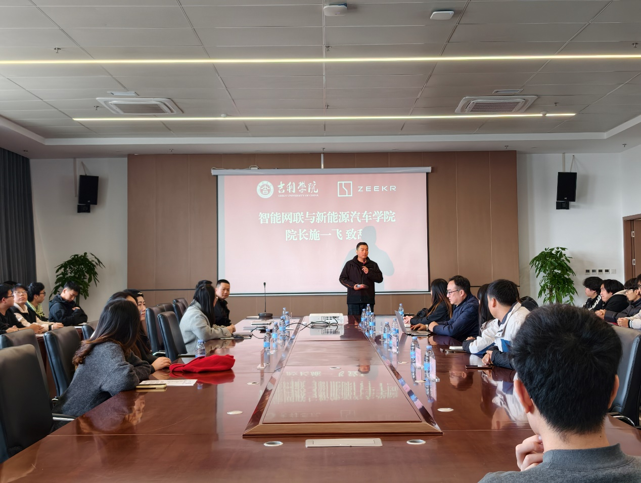 随后,极氪科技集团服务培训经理曾斌强详细介绍了极氪品牌的发展布局、技术优势及人才需求战略。他表示,极氪作为新能源汽车行业的领军企业,始终重视人才培养与储备,极氪曙光班将通过 "企业定制课程 + 一线导师授课 + 全程动手实操" 的培养模式,让学生在学习期间就能接触行业前沿技术和真实项目案例,实现理论与实践的深度融合。